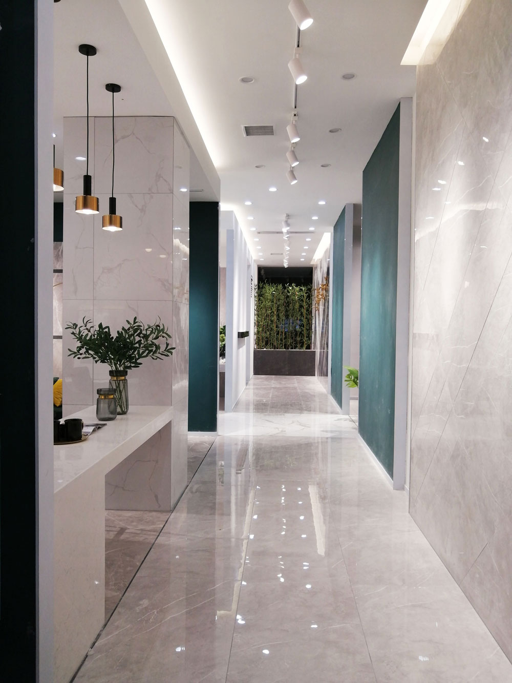 这是现代简约过道,地面由通体大理石600*1200规格鱼肚白KA9M61213直铺,砖面纹理大气自然,不用担心白色砖难清洁,易清洁是亮面砖的优势,白色砖铺贴的空间也更宽阔明亮,无论是大空间还是小空间都很适合。“转身、回头、微笑”留下美好一瞬间。