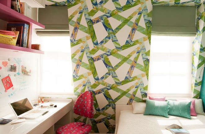 在一个拥挤的空间里,在墙上涂鸦或是贴上壁画,尽显主人的风格个性。图中漂亮的墙纸设计连接着淡蓝色的墙壁,提升了整个卧室空间的凝聚力,让卧室更有个性。